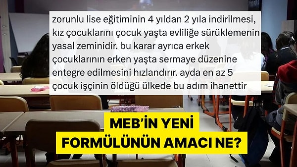 Geçtiğimiz günlerde 4 yıllık zorunlu lise eğitiminin 2 yıla düşeceği iddiaları gündeme gelmişti. Milli Eğitim Bakanı Yusuf Tekin iddiaları tam olarak kabul etmese de reddettiği de söylenemez. Durumun değerlendirileceğini belirten Tekin'in sözleri bu değişikliğin ciddi olduğu şeklinde yorumlandı. Ancak sosyal medyada bu duruma tepkiler gecikmedi.