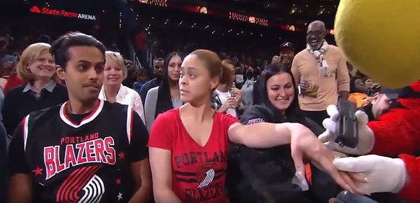 Atlanta Hawks-Trail Blazers karşılaşmasında yaşanan ilginç anlar kameralara yansıdı. Bir seyircinin yüzüğünde ölçüm yapan maskot, o kadının yüzüğünün sahte olduğunu ortaya çıkardı. Yüzüğünün sahte olduğunu öğrenen kadın da yüzüğü erkek arkadaşının yüzüne fırlatarak stadyumdan ayrıldı.