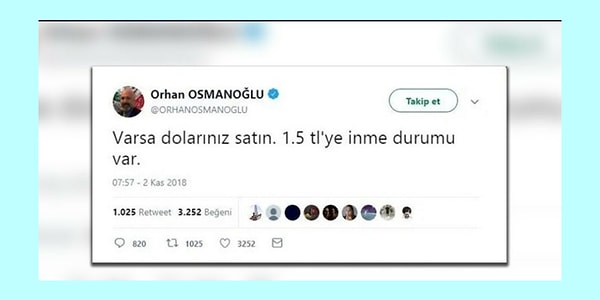 Tabii bu tweetin atıldığında dolar 5.40 civarındaymış. Paylaşımdan beri yaklaşık %70 artmış.