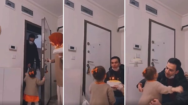 Babası işten gelen ufaklık, annesiyle birlikte babasını kapıda karşılayıp doğum gününü kutluyor. O anları izlerken içiniz ısınacak...