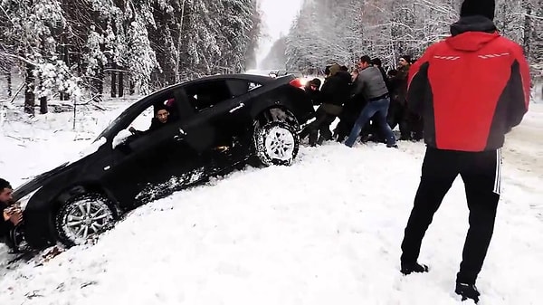 Kara Saplanan Arabayı İnsan Gücüyle Kurtarmak