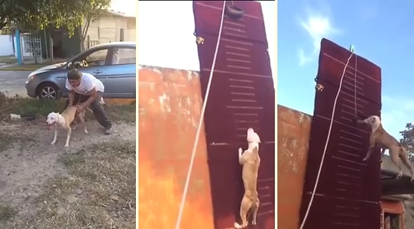 Eğitimli ve aşırı güçlü köpek düz duvarın tepesinde bulunan hedefi yakalıyor.