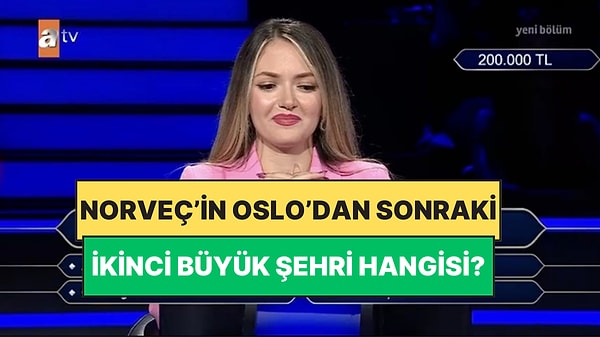 31 Ağustos Pazar akşamı ATV'de yayınlanan Kim Milyoner Olmak İster'de 'Norveç'in Başkenti Oslo'dan Sonra En Büyük İkinci Şehrinin Adı Nedir?' sorusu soruldu. 200 bin TL'lik sorunun cevabı merak uyandırırken yarışmacı soru üzerine bir hayli düşündü.