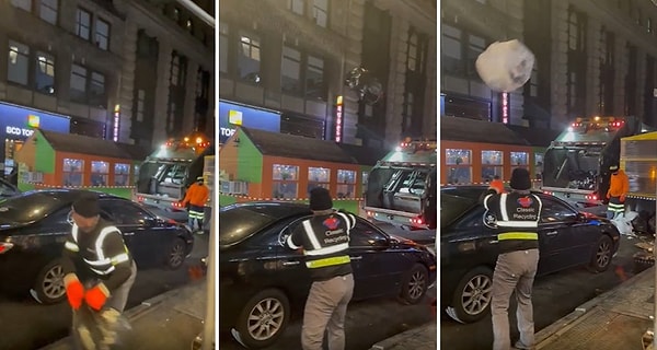 New York'ta bir temizlik işçisi, çöp poşetlerini tek tek arabaya taşımak yerine metrelerce uzaktan fırlatıyor. Videoya kaydedilen görüntülerde de %100 başarı ile poşetleri çöp arabasına sokuyor.